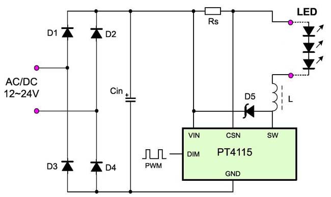 Схемы драйверов мощных светодиодов на PT4115, CL6808 Микросхемы PT4115 и CL6808 являются полными аналогами и взаимозаменяют друг друга. Микросхемы являются step-down конвертерами, что означает, напряжение выхода всегда будет менее напряжения на входе. От напряжения питания (7-40 вольт) зависит количество диодов, присоединенных к выходу. Максимальный выходной ток 1,2 ампера = 1200 мА. На этих микросхемах собрано большинство низковольтных лампочек с цоколем MR16. PT4115 производит китайская компания CR-PowTech, образовання в 2004 году. СL6808 производит компания Chiplink Semiconductor. SOT89-5 корпус микросхемы PT4115, схема включения и фото драйвера на микросхеме PT4115 Схемотехника предельно простая: диодный мост D1-D4 переменное напряжение питания преобразует в постоянное, сглаживающий конденсатор Cin, токозадающий низкоомный резистор Rs, диод Шоттки D5 с малым падением напряжения (около 0,4 вольта) для высокого КПД, катушка индуктивности L - дроссель. Если напряжение питания постоянное, то диодный мост и конденсатор избыточны в схеме. Выпаяв штыри-вилки с платы получим сверхкомпактную плату драйвера. Токозадающий резистор Rs: меньше сопротивление - выше выходной ток. Резистор номиналом 0,3 Ома для выходного тока 320 мА, номиналом 0,15 Ома для выходного тока 670 мА. Считается по формуле: Rs = 0,1 / Iout. Для подбора точного тока резисторы паяем друг на друга бутербродом, благо размер SMD2516 позволяет. Микросхемы имеют выход димминга DIM (ADJ). Управлять яркостью возможно переменным резистором или ШИМ сигналом, например, от таймера 555. Есть данные, что диммирование у PT4115 происходит плавнее, чем у конкурента, поэтому её любят сильнее. Существует микросхема CL6807 с максимальным выходным током 1,0 А, что чуть слабее CL6808 с током 1,2 А. Купить микросхему PT4115